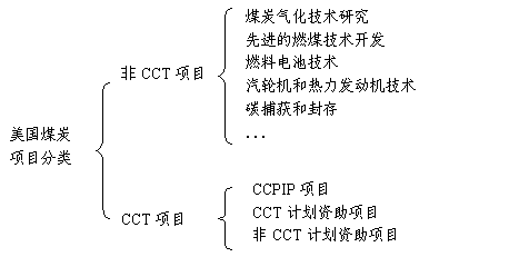 一、美國(guó)煤炭利用技術(shù)研發(fā)項(xiàng)目剖析 美國(guó)是世界上最大的能源生產(chǎn)、消費(fèi)和進(jìn)口大國(guó),煤炭?jī)?chǔ)量居世界首位,在該國(guó)能源結(jié)構(gòu)中占有重要地位。為解決煤炭利用引起的環(huán)境污染問(wèn)題和保證電力供應(yīng)的可靠性,美國(guó)從20世紀(jì)80年代中期就已經(jīng)開(kāi)始制定相關(guān)戰(zhàn)略規(guī)劃,實(shí)施煤炭高效清潔利用的研究項(xiàng)目,解決了低質(zhì)煤炭提質(zhì)、煤炭氣化液化、混煤燃燒系統(tǒng)開(kāi)發(fā)、高效燃燒系統(tǒng)開(kāi)發(fā)、超(超)臨界循環(huán)系統(tǒng)和零排放等研究中許多關(guān)鍵的技術(shù)問(wèn)題。這些項(xiàng)目的成功研究和開(kāi)發(fā)利用,使美國(guó)政府在應(yīng)對(duì)國(guó)際國(guó)內(nèi)能源危機(jī)上發(fā)揮了重要作用。對(duì)美國(guó)煤炭利用科技項(xiàng)目的剖析,有助于了解美國(guó)煤炭科技戰(zhàn)略規(guī)劃和發(fā)展。 結(jié)合美國(guó)能源部對(duì)煤炭利用項(xiàng)目的分類,根據(jù)是否屬于潔凈煤技術(shù)研究范圍,把美國(guó)煤炭項(xiàng)目主要分為兩大類:一類是非潔凈煤利用項(xiàng)目(簡(jiǎn)稱非CCT項(xiàng)目),另一類是以研究煤炭清潔利用和污染排放控制為主的潔凈煤技術(shù)項(xiàng)目(簡(jiǎn)稱CCT項(xiàng)目),具體分類如圖1所示。