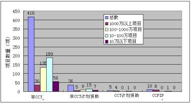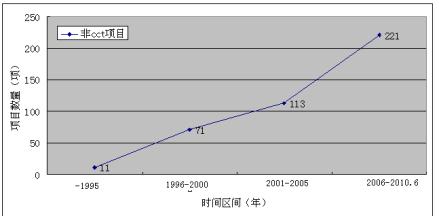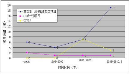 注:CCT:Clean Coal Technology????? 1.各類項(xiàng)目數(shù)量變化情況 20年來(lái),非CCT項(xiàng)目數(shù)量大幅增長(zhǎng)。1995年以前,美國(guó)非CCT項(xiàng)目共11項(xiàng);1996~2001年間增加到71項(xiàng),到2006年以后,增長(zhǎng)到221項(xiàng),其增長(zhǎng)的絕對(duì)數(shù)量為歷史最高(見(jiàn)圖2)。
