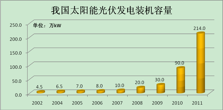2011年,我國太陽能光伏發(fā)電并網(wǎng)裝機(jī)容量達(dá)到214萬千瓦。