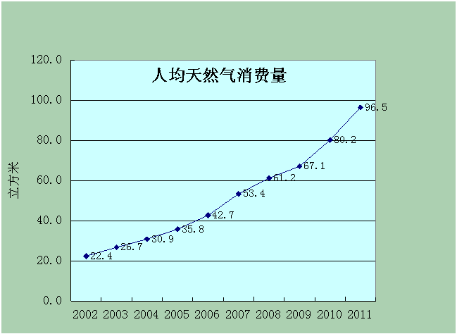 ????我國(guó)天然氣消費(fèi)量從2002年的287.7億立方米迅速增長(zhǎng)到2011年的1300億立方米,人均天然氣消費(fèi)量翻了兩番多。 |