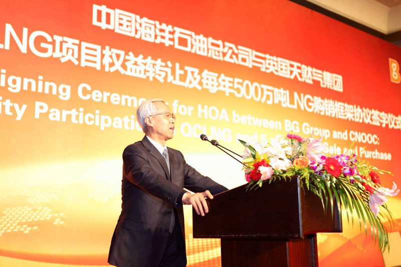 張玉清出席中海油與英國BG集團(tuán)LNG項(xiàng)目權(quán)益轉(zhuǎn)讓及500萬噸LNG購銷框架協(xié)議簽約儀式并致辭