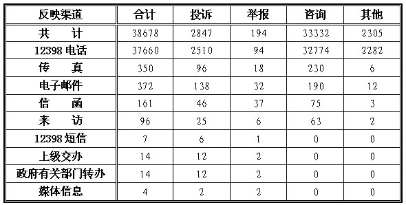 ????為了保護(hù)電力投資者、經(jīng)營者、使用者的合法權(quán)益,維護(hù)能源市場秩序,依法履行職責(zé),國家能源局積極暢通投訴舉報(bào)渠道,切實(shí)發(fā)揮全國范圍內(nèi)12398(含12398電話、傳真、電子郵件等)投訴舉報(bào)的作用,認(rèn)真處理人民群眾對違法違規(guī)行為的投訴舉報(bào),定期公布能源監(jiān)管機(jī)構(gòu)對投訴舉報(bào)的處理情況?,F(xiàn)將2013年度12398投訴舉報(bào)處理情況通報(bào)如下: ????一、基本情況 ????(一)受理情況 ????2013年,共收到12398投訴舉報(bào)有效信息38678件,同比增長36.80%。 ????按訴求性質(zhì)分類:投訴2847件,占有效信息的7.36%,同比增加284件;舉報(bào)194件,占有效信息的0.50%,同比減少36件;咨詢33332件,占有效信息的86.18%,同比增加10608件;表揚(yáng)、求助、建議等其他方面2305件,占有效信息的5.96%,同比減少452件。 ????按反映渠道分類:12398電話37660件,傳真350件,電子郵件372件,信函161件,來訪96件,短信7件,上級交辦14件,政府有關(guān)部門轉(zhuǎn)辦14件,媒體信息4件。(2013年投訴舉報(bào)受理情況見表一) 表一 2013年投訴舉報(bào)受理情況 單位:件