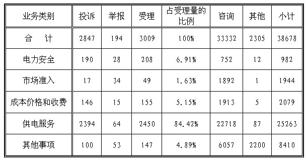 ????(二)辦理情況 ????根據(jù)國家有關(guān)法律法規(guī)規(guī)定,對2013年收到的3041件投訴舉報(bào)中的3009件進(jìn)行了受理,占有效信息的7.80%;對不屬于監(jiān)管職能范圍的32件不予受理,占有效信息的0.08%。 ????截至2013年12月底,已辦理完畢2861件,占投訴舉報(bào)受理量的95.08%;對未辦結(jié)的148件結(jié)轉(zhuǎn)2014年辦理,占投訴舉報(bào)受理量的4.92%。 ????(三)業(yè)務(wù)分類情況 ????2013年,能源監(jiān)管機(jī)構(gòu)收到的38678件有效信息中,供電服務(wù)25263件,成本價(jià)格和收費(fèi)2079件,市場準(zhǔn)入1944件,電力安全982件,其他事項(xiàng)8410件。 ????從收到的投訴舉報(bào)情況看,供電服務(wù)方面的最多,共2458件,占投訴舉報(bào)的80.83%;電力安全方面的第二,共218件,占投訴舉報(bào)的7.17%;成本價(jià)格和收費(fèi)方面的第三,共161件,占投訴舉報(bào)的5.29%。(2013年投訴舉報(bào)業(yè)務(wù)分類情況見表二) 表二 2013年投訴舉報(bào)業(yè)務(wù)分類情況 單位:件