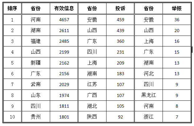 ?????(四)區(qū)域分布情況 ????2013年,從能源監(jiān)管機(jī)構(gòu)收到的12398有效信息來看,河南、湖南、福建、山西、新疆排在全國前5位;從投訴數(shù)量來看,安徽、山西、廣東、四川、上海排在全國前5位;從舉報(bào)數(shù)量看,安徽、山西、上海、廣東、湖南排在全國前5位。(2013年有效信息及投訴、舉報(bào)數(shù)量排名前10位省份情況見表三) 表三 2013年有效信息及投訴、舉報(bào)數(shù)量排名前10位省份情況 單位:件