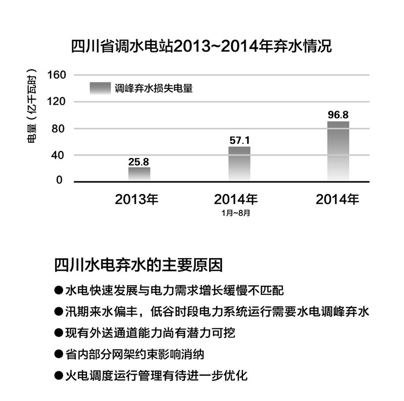 國(guó)家能源局發(fā)布的《水電基地棄水問(wèn)題駐點(diǎn)四川監(jiān)管報(bào)告》顯示 五大主因致四川水電棄水 2014年調(diào)峰棄水電量96.8億千瓦時(shí) ????我國(guó)水電發(fā)電量去年歷史性突破1萬(wàn)億千瓦時(shí),為能源供給增添了一抹綠色。然而,欣喜之余,我們難以隱忍棄水之殤。 ????國(guó)家能源局日前發(fā)布的《水電基地棄水問(wèn)題駐點(diǎn)四川監(jiān)管報(bào)告》(以下簡(jiǎn)稱《報(bào)告》)披露,2014年四川調(diào)峰棄水電量達(dá)96.8億千瓦時(shí),占豐水期水電發(fā)電量的14.93%。 ????《報(bào)告》根據(jù)工作組駐點(diǎn)四川監(jiān)管情況,深入分析了導(dǎo)致水電棄水的5大主因,并就突出問(wèn)題提出了監(jiān)管建議。 ????(一)水電快速發(fā)展、電力需求增長(zhǎng)緩慢,四川水電棄水壓力山大 ????近兩年,伴隨著我國(guó)加快轉(zhuǎn)變電力發(fā)展方式,著力推進(jìn)電力結(jié)構(gòu)優(yōu)化和產(chǎn)業(yè)升級(jí),四川水電呈現(xiàn)集中投產(chǎn)態(tài)勢(shì),與之相對(duì)應(yīng)的水電消納和棄水相伴相生。 ????一方面,水電集中投產(chǎn)?!笆濉逼陂g,四川每年有1000萬(wàn)千瓦以上水電裝機(jī)增長(zhǎng),至2014年9月底,其水電裝機(jī)達(dá)6028萬(wàn)千瓦,占全省總裝機(jī)比例由2013年的76.74%上升到79.4%。 ????另一方面,省內(nèi)、省外消納市場(chǎng)持續(xù)低迷。四川省內(nèi)售電量增速已由“十二五”初的16.4%下降到3.4%。而華中、華東區(qū)域電力供需寬松,外購(gòu)電意愿不強(qiáng)。 ????《報(bào)告》指出,盡管四川省政府及各電力企業(yè)積極作為,給政策、強(qiáng)電網(wǎng),力促水電消納,但四川水電棄水情況依然存在。 ????據(jù)核查統(tǒng)計(jì),2014年1-8月四川省調(diào)(不含國(guó)調(diào)廠)水電站共產(chǎn)生調(diào)峰棄水損失電量57.1億千瓦時(shí)(含調(diào)峰、檢修等正常棄水),較2013年有所增長(zhǎng)(如圖所示)。