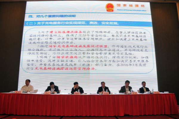 ??? 為落實9月23日、9月29日的第106次和107次國務院常務會議關于加快電動汽車充電基礎設施建設的有關部署,成立充電基礎設施促進聯(lián)盟,交流建設經驗,推動全國充電基礎設施加快建設,國家能源局于10月12日在常州召開全國新能源汽車充電基礎設施建設現(xiàn)場會。圖為大會主席臺。周柏豫攝 |