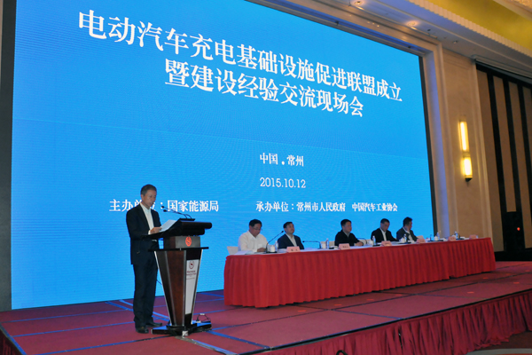 ??? 為落實9月23日、9月29日的第106次和107次國務(wù)院常務(wù)會議關(guān)于加快電動汽車充電基礎(chǔ)設(shè)施建設(shè)的有關(guān)部署,成立充電基礎(chǔ)設(shè)施促進聯(lián)盟,交流建設(shè)經(jīng)驗,推動全國充電基礎(chǔ)設(shè)施加快建設(shè),國家能源局于10月12日在常州召開全國新能源汽車充電基礎(chǔ)設(shè)施建設(shè)現(xiàn)場會。圖為國家電網(wǎng)公司副總經(jīng)理楊慶發(fā)言。周柏豫攝 |