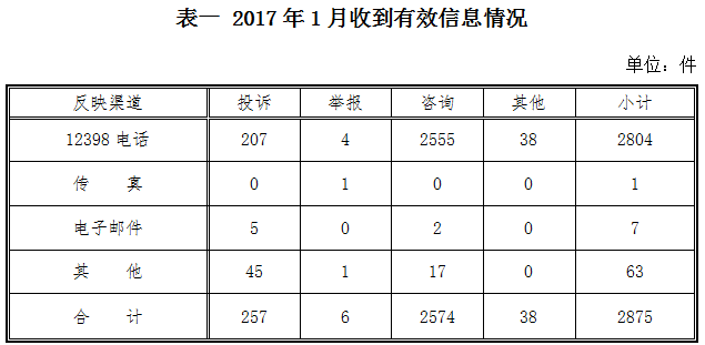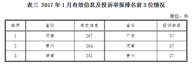 ????(三)區(qū)域分布情況 ????各?。ㄗ灾螀^(qū)、直轄市)按照收到的有效信息數(shù)量排序,河南、貴州、湖南列全國(guó)前3位;按照投訴舉報(bào)數(shù)量排序,廣東、河南、貴州排在全國(guó)前3位。(2017年1月有效信息及投訴舉報(bào)排名前3位情況見(jiàn)表三)