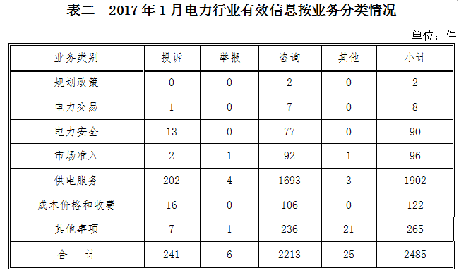 ????(二)分類(lèi)情況 ????1月收到的有效信息中,電力行業(yè)類(lèi)2485件,占86.43%;新能源和可再生能源行業(yè)類(lèi)79件,占2.75%;石油天然氣行業(yè)類(lèi)35件,占1.22%;煤炭行業(yè)類(lèi)2件,占0.07%;其他事項(xiàng)274件,占9.53%。 ????投訴舉報(bào)主要集中在電力行業(yè),共247件。從業(yè)務(wù)分類(lèi)情況看,供電服務(wù)方面206件,占83.40%;電力安全方面13件,占5.26%;成本價(jià)格和收費(fèi)16件,占6.48%;市場(chǎng)準(zhǔn)入方面3件,占1.21%;電力交易方面1件,占0.41%;其他事項(xiàng)8件,占3.24%。(2017年1月電力行業(yè)有效信息按業(yè)務(wù)分類(lèi)情況見(jiàn)表二)