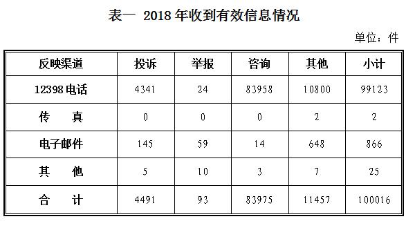 ????一、基本情況 ????2018年,國家能源局12398能源監(jiān)管熱線共收到有效信息100016件,同比增加39.9%。 ????按訴求性質分類,投訴4491件,占有效信息的4.49%;舉報93件,占有效信息的0.09%;咨詢83975件,占有效信息的83.96%;表揚、求助、建議等其他方面11457件,占有效信息的11.46%。 ????按反映渠道分類,12398電話99123件,傳真2件,電子郵件866件,其他25件。(2018年收到有效信息情況見表一)