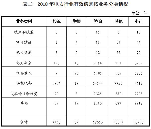 ????二、分類情況 ????2018年收到的有效信息中,電力行業(yè)類73906件,占73.89%;新能源和可再生能源行業(yè)類13764件,占13.76%;石油天然氣行業(yè)類2887件,占2.89%;煤炭行業(yè)類74件,占0.07%;其他事項9385件,占9.38%。 ????投訴舉報主要集中在電力行業(yè),共4238件。從業(yè)務分類情況看,項目建設方面7件,占0.17%;電力交易方面5件,占0.12%;電力安全方面208件,占4.91%;市場準入方面27件,占0.64%;供電服務方面3822件,占90.18%;成本價格和收費方面93件,占2.19%;其他方面76件,占1.79%。(2018年電力行業(yè)有效信息按業(yè)務分類情況見表二)。