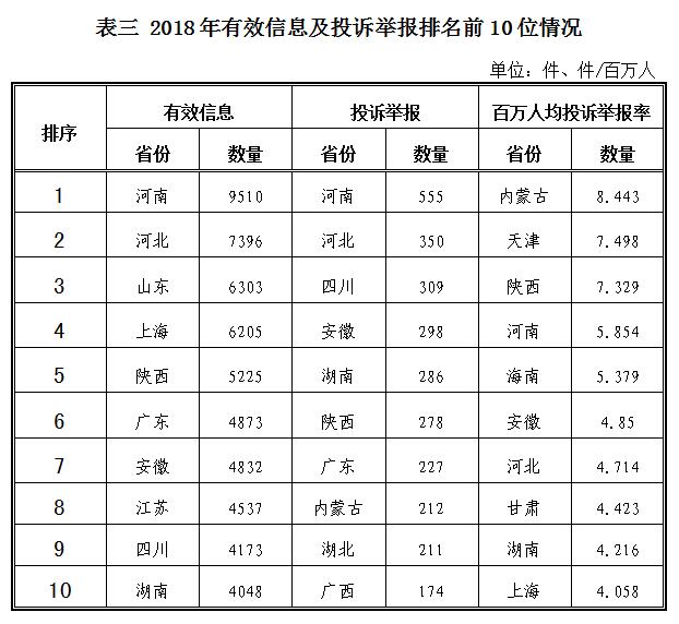 ????三、分布情況 ????各省(自治區(qū)、直轄市)按照收到的有效信息數(shù)量排序,河南、河北、山東、上海、陜西、廣東、安徽、江蘇、四川、湖南列全國前10位;按照投訴舉報數(shù)量排序,河南、河北、四川、安徽、湖南、陜西、廣東、內蒙古、湖北、廣西排在全國前10位。 ????按照百萬人均投訴舉報數(shù)量排序,內蒙古,天津,陜西,河南,海南等排在全國前10位。(2018年有效信息及投訴舉報排名前10位情況見表三)
