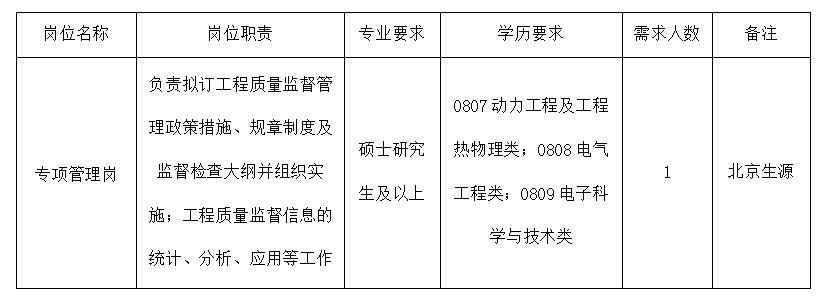 國家能源局電力可靠性管理和工程質(zhì)量監(jiān)督中心(以下簡稱“中心”)是經(jīng)中央編制委員會辦公室批準(zhǔn)成立的國家能源局直屬事業(yè)單位,主要職責(zé)是負(fù)責(zé)全國電力可靠性管理和工程質(zhì)量監(jiān)督工作。因工作需要,根據(jù)《事業(yè)單位人事管理?xiàng)l例》和《事業(yè)單位公開招聘人員暫行規(guī)定》,擬開展應(yīng)屆畢業(yè)生招聘工作,現(xiàn)將有關(guān)事項(xiàng)公告如下: 一、報(bào)考范圍和條件 ?。ㄒ唬﹫?bào)考范圍 本次招聘面向2022年全國應(yīng)屆畢業(yè)生(不含定向生、委培生)。報(bào)考人員在校期間所修課程全部合格,畢業(yè)時須取得與最高學(xué)歷對應(yīng)的學(xué)歷學(xué)位證書,崗位要求專業(yè)條件為報(bào)考者即將獲得的最高學(xué)歷對應(yīng)專業(yè)。 北京生源指入讀高校前為北京市常住戶口的學(xué)生。 (二)報(bào)考人員應(yīng)符合以下條件: 1.具有中華人民共和國國籍; 2.擁護(hù)并遵守中華人民共和國憲法和法律; 3.具有良好的品行; 4.具有正常履行職責(zé)的身體條件; 5.具有符合崗位要求的工作能力和實(shí)踐經(jīng)歷; 6.人事檔案完備,無違法違紀(jì)、受處分或其他不良記錄; 受過刑事處罰的、被開除公職的、正在接受紀(jì)律審查的或涉嫌違法犯罪正在接受調(diào)查的人員,以及有法律規(guī)定不得應(yīng)聘為事業(yè)單位工作人員的,不得報(bào)考。應(yīng)聘人員不得報(bào)考聘用后構(gòu)成回避關(guān)系的招聘崗位。 二、招聘崗位及相關(guān)要求