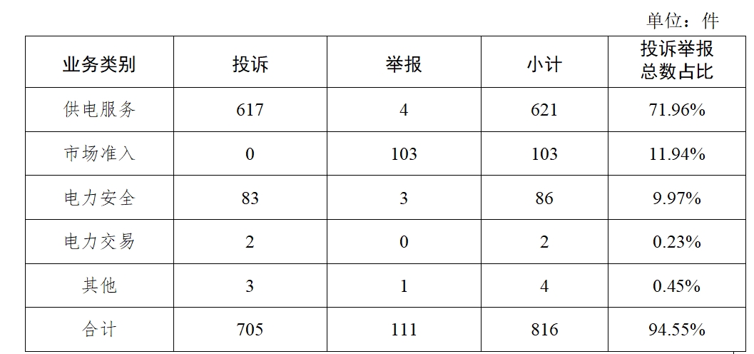 圖一 2023年9月接收投訴舉報(bào)分布圖 ?。ㄒ唬┓诸惽闆r 1.按被投訴舉報(bào)行業(yè)分類 電力行業(yè)排在首位,數(shù)量為816件、占投訴舉報(bào)總數(shù)的94.55%,主要集中在供電服務(wù)、市場(chǎng)準(zhǔn)入、電力安全等方面。 表一 電力行業(yè)接收投訴舉報(bào)業(yè)務(wù)分類情況表