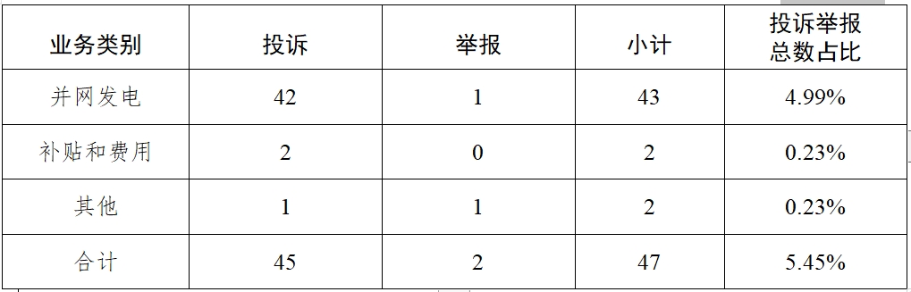 新能源和可再生能源行業(yè)排在第二位,數(shù)量為47件、占投訴舉報(bào)總數(shù)的5.45%,主要集中在并網(wǎng)發(fā)電、補(bǔ)貼和費(fèi)用等方面。 表二 新能源和可再生能源行業(yè)接收投訴舉報(bào)業(yè)務(wù)分類情況表